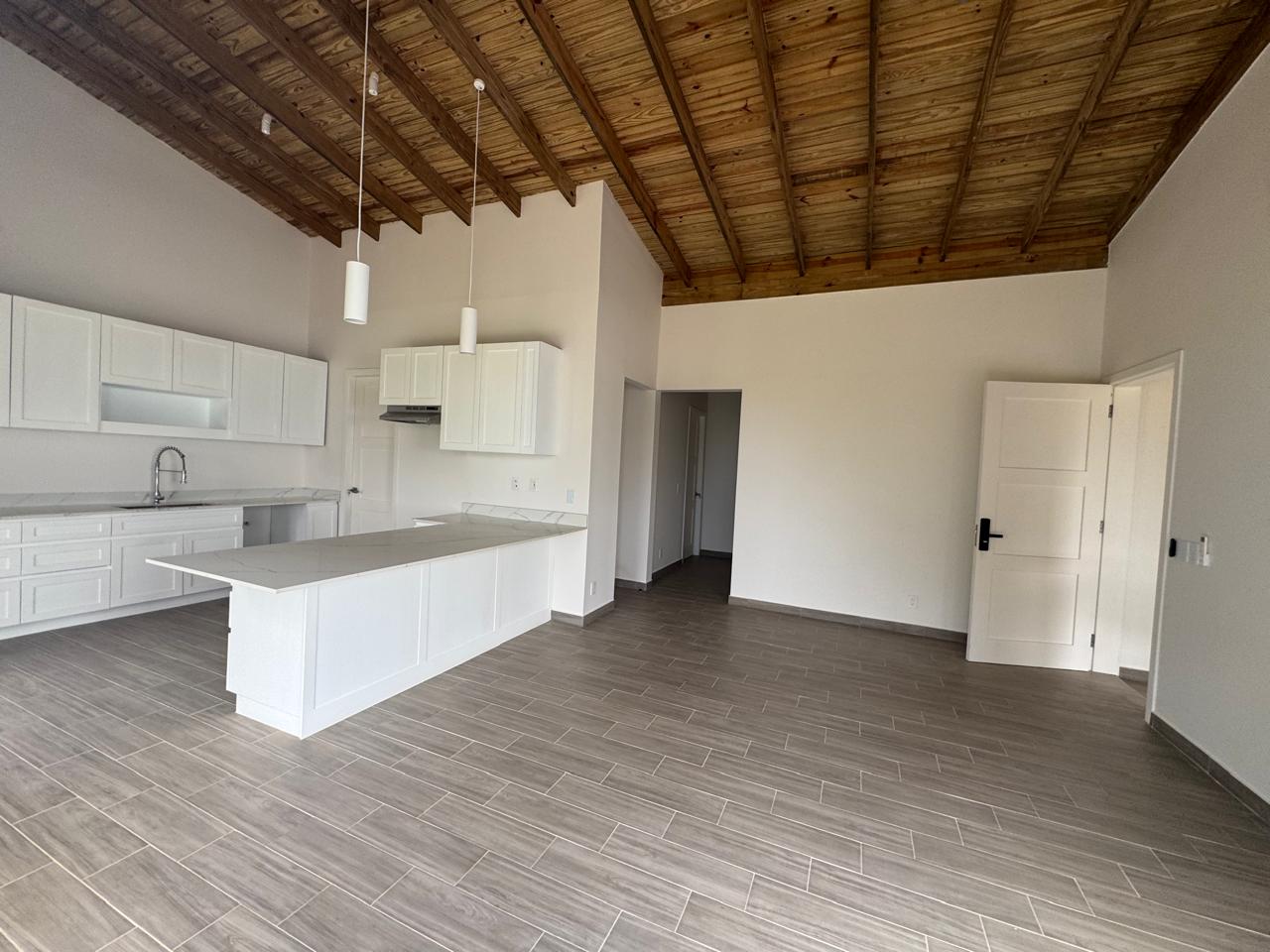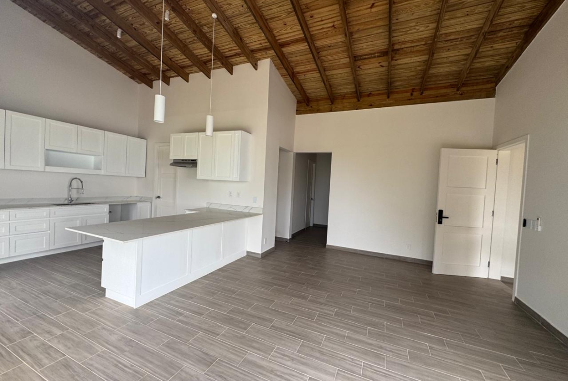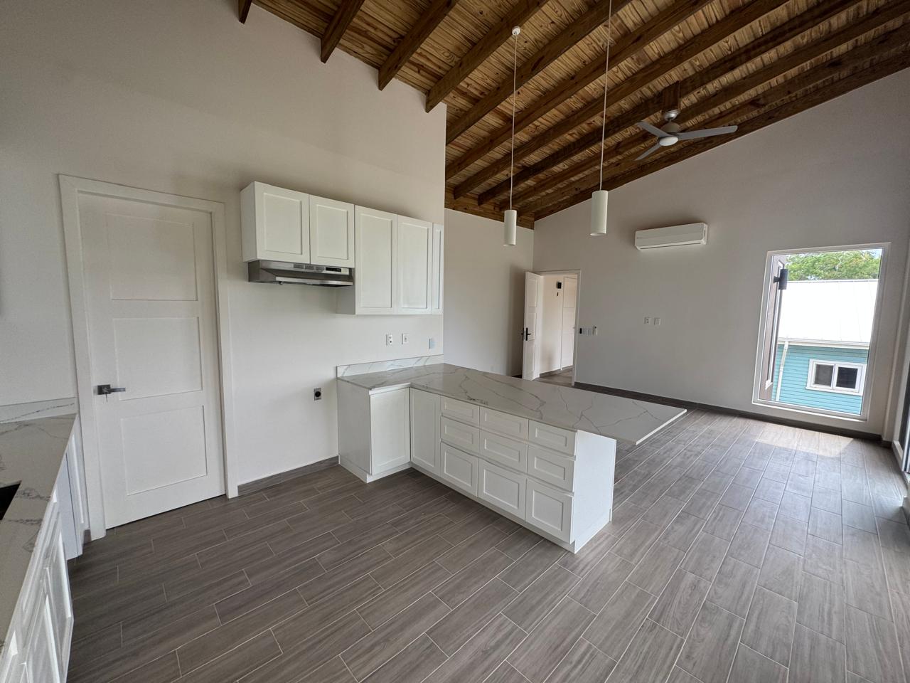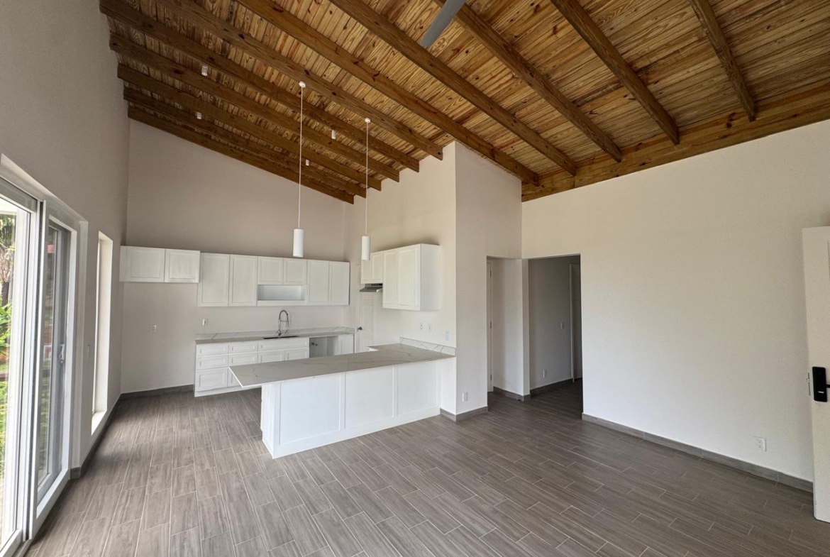 The high, tongue-and-groove pine ceilings throughout the kitchen, living room, and bedrooms add warmth and a true island feel to this modern space. There’s also a half bath conveniently located off the living room and a separate laundry room just off the kitchen for added convenience.