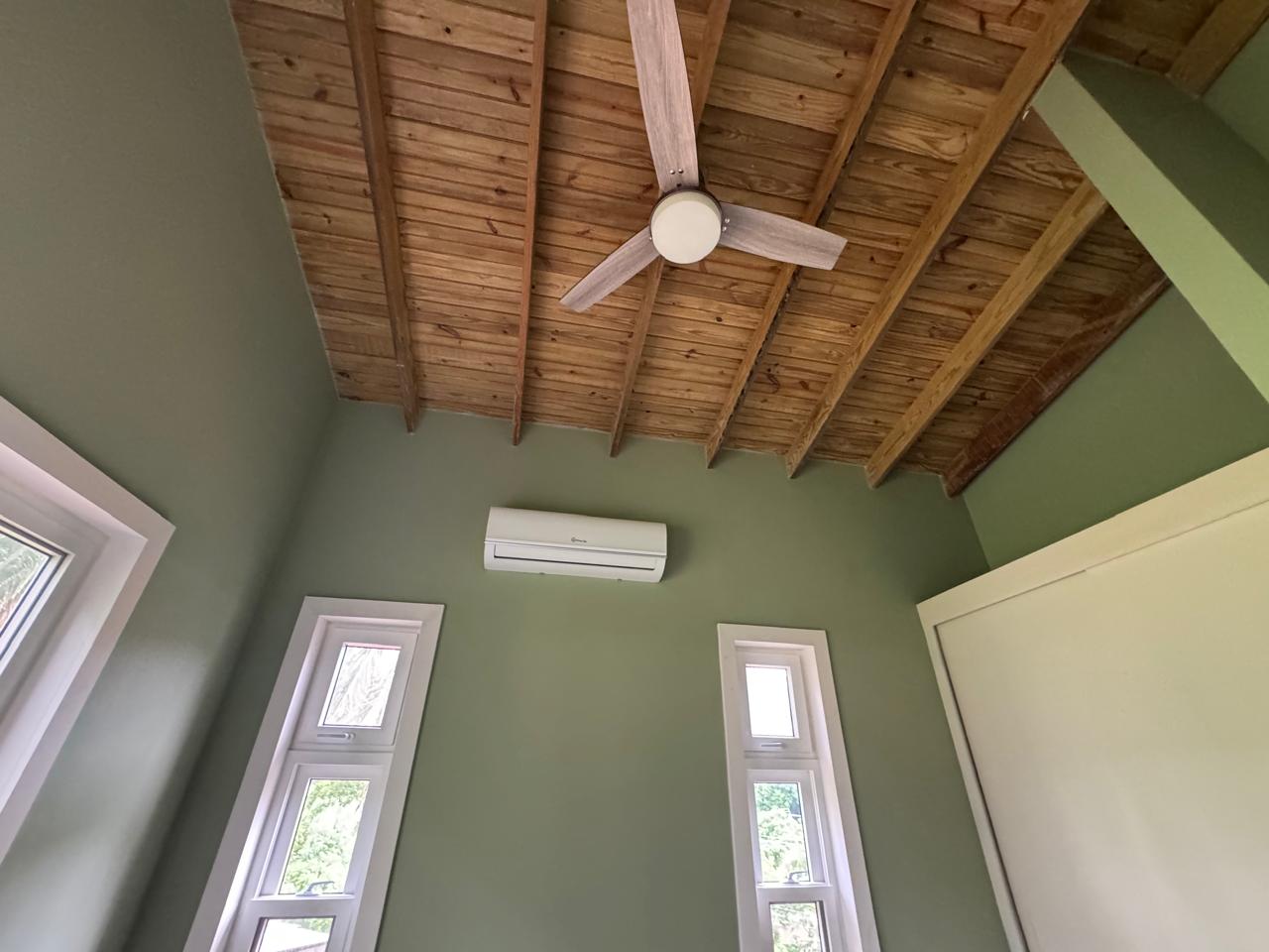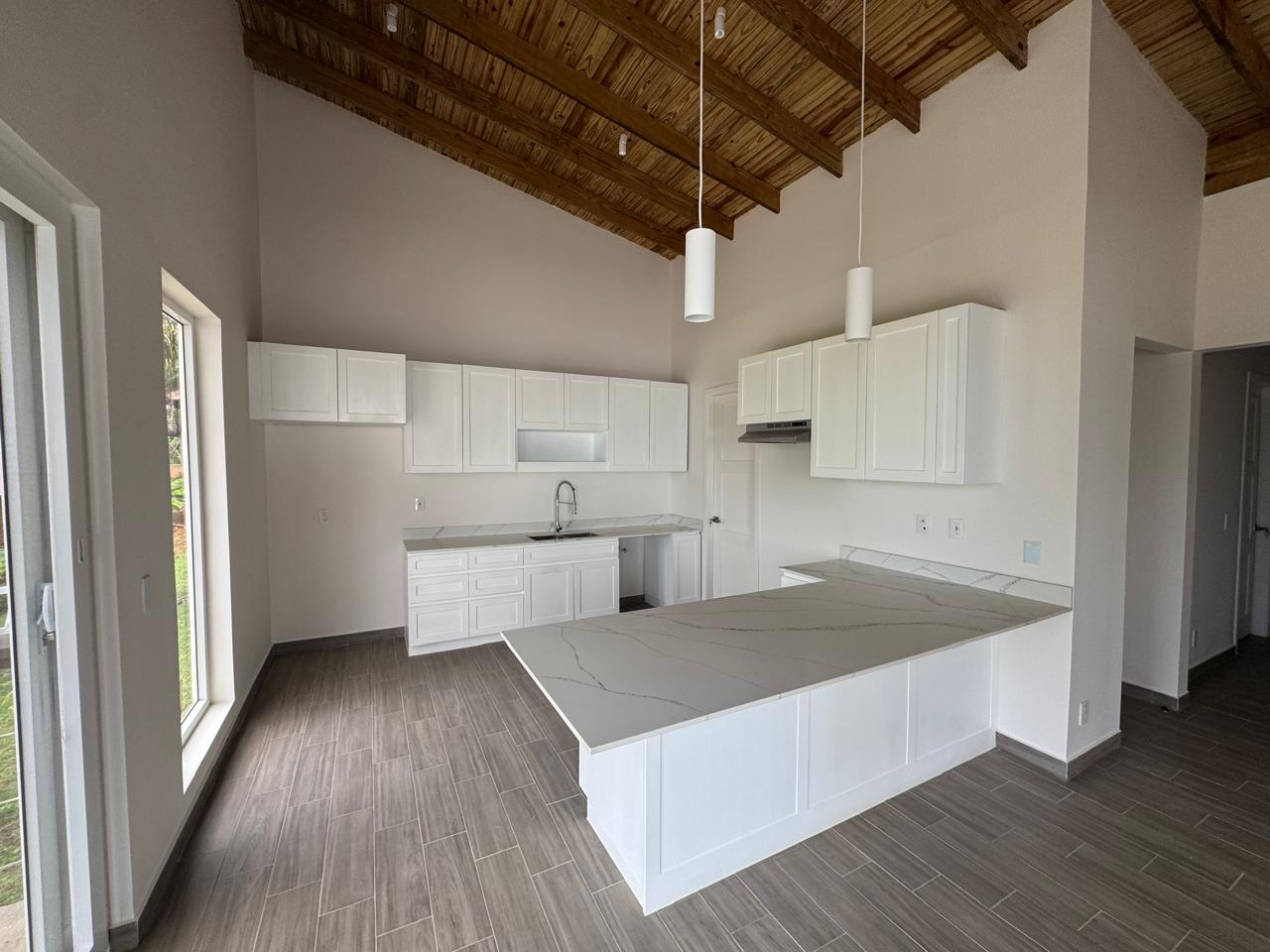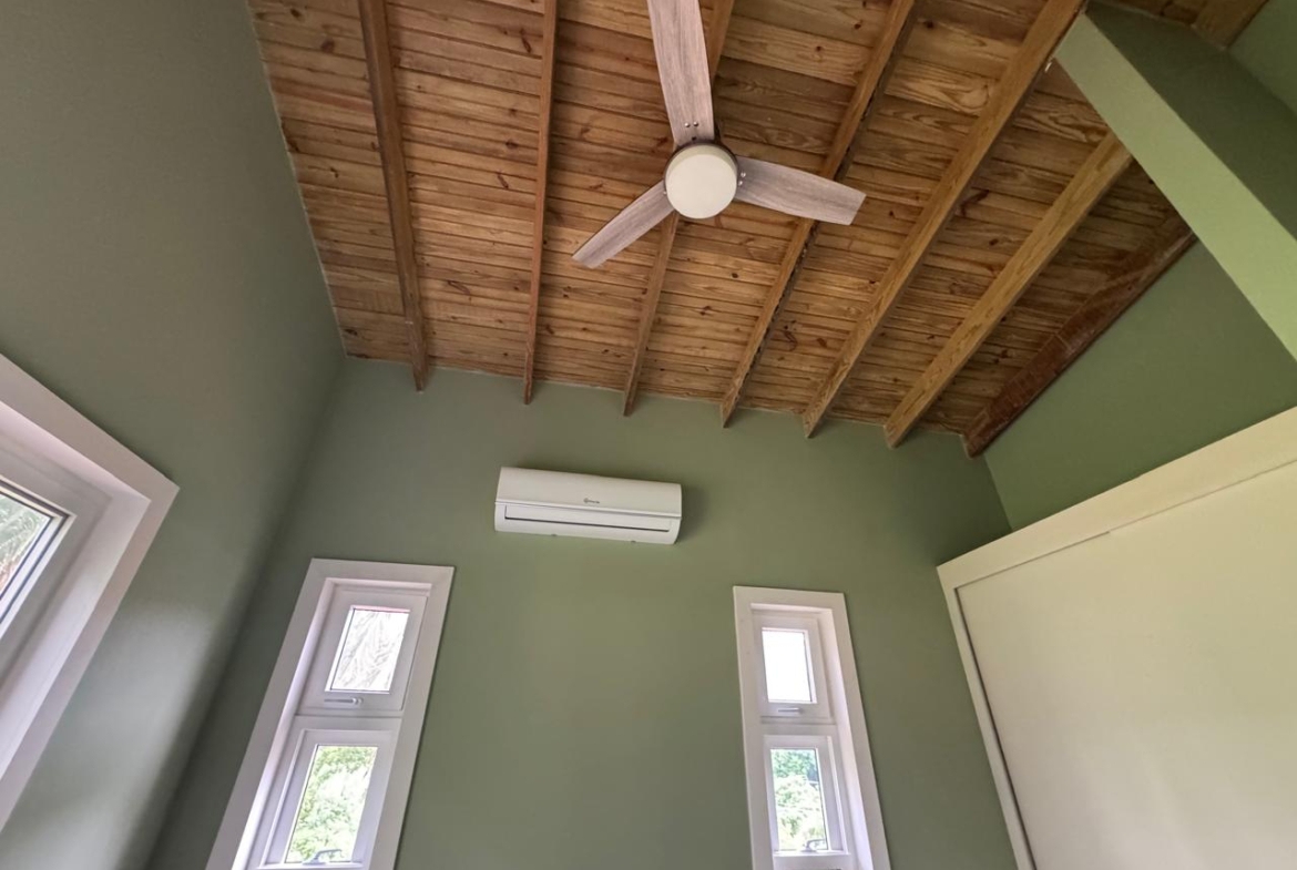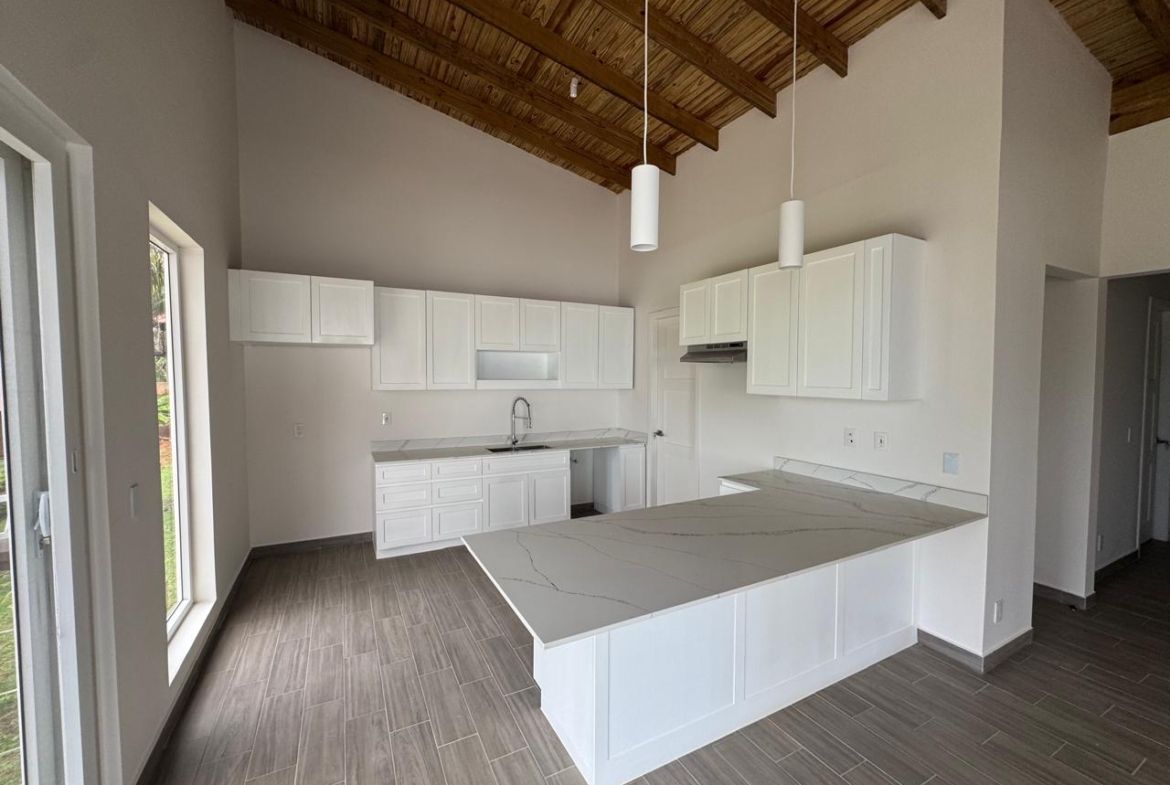 The high, tongue-and-groove pine ceilings throughout the kitchen, living room, and bedrooms add warmth and a true island feel to this modern space. There’s also a half bath conveniently located off the living room and a separate laundry room just off the kitchen for added convenience.